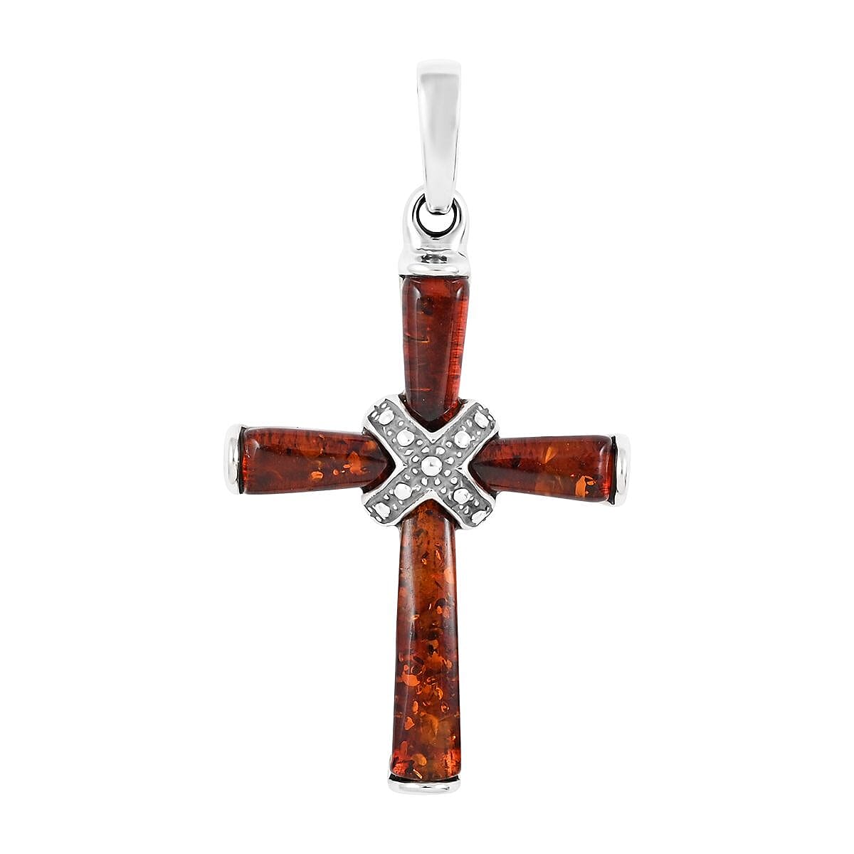 Inspired by the Latin cross sign, this Baltic cognac-colored amber cross pendant is artfully designed. This unique cross pendant features chunky rounded tips and intersection with lustrous metal work. Baltic amber on cross lines flaunts cognac colors. Known as a "window to the past, "Baltic amber is a fossilized pine tree resin. The Latin Cross is one of the crosses that are used to symbolize the Christian faith. This designer pendant is drenched in sterling silver.