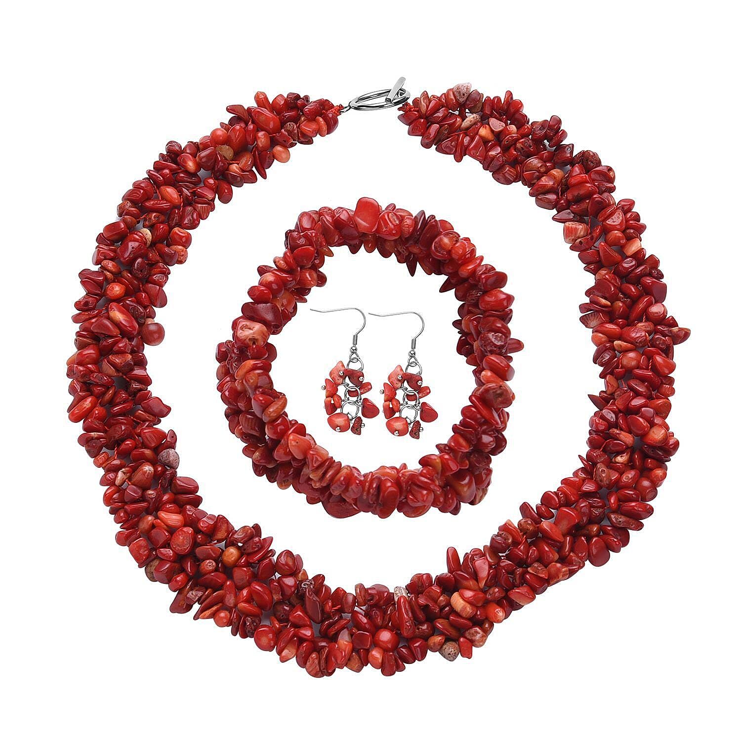 Add a vibrant touch to your jewelry collection with the bamboo coral chips jewelry set in stainless steel. Feature stretch bracelet and earrings and toggle clasp necklace. This set features stunning coral chips that create a striking contrast.