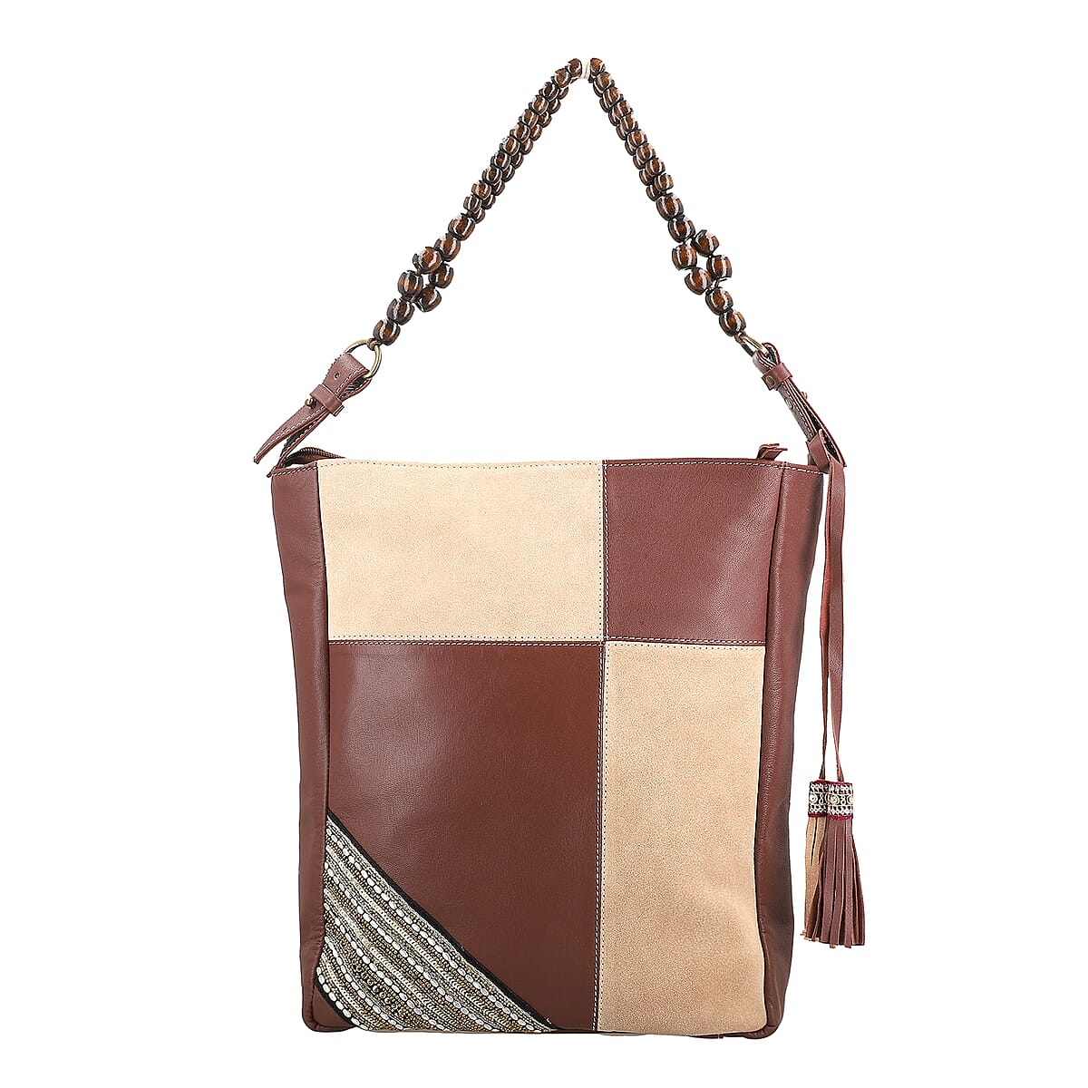 Beige and Mustard Genuine Leather Embellishment Tote Bag
