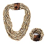 Beige Seed Beaded and Shell Wooden Buckle Bracelet (8in) and Multi Strand Necklace 19 Inches