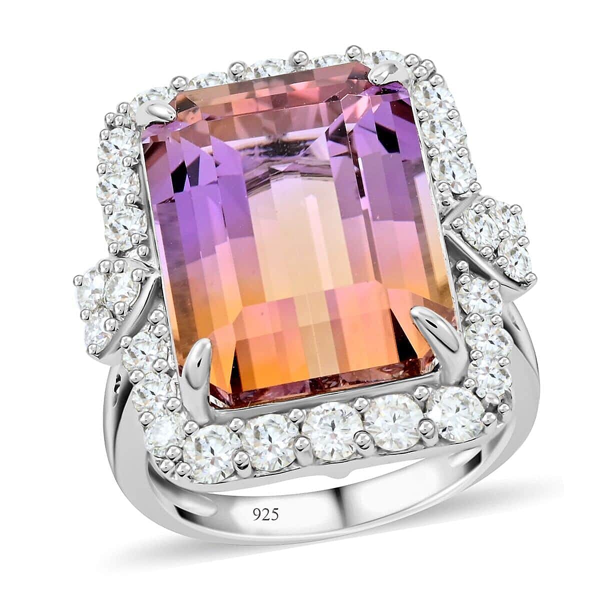 The Bi-Color Ametrine and Moissanite Ring in Sterling Silver is a beautifully designed piece that blends elegance and durability, perfect for any occasion, making it an exquisite addition to any jewelry collection.