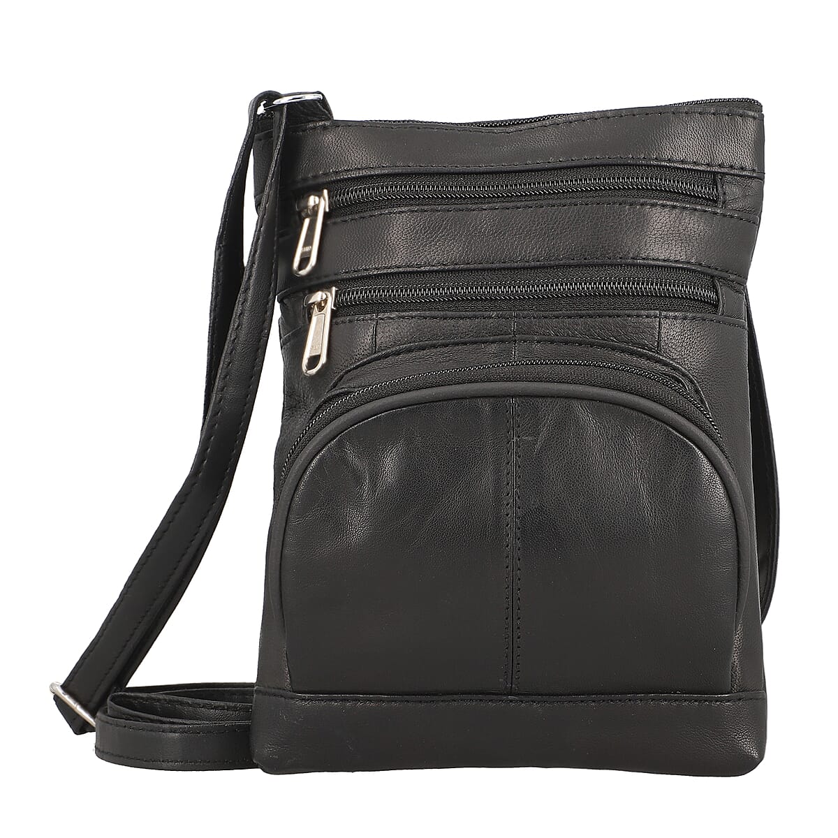 Black 100% Genuine Leather Triple Zip Sling Crossbody Messenger RFID Bag with Adjustable Shoulder Strap