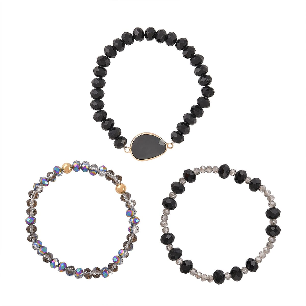Black Agate, Magic, Black, Gray Color Glass Beaded & Resin 5.00 ctw Set of 3 Stretch Bracelet in Goldtone