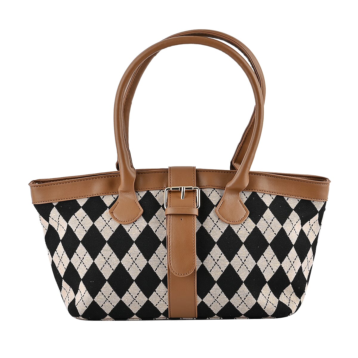 Black and Khaki Checkered Pattern Faux Leather Tote Bag