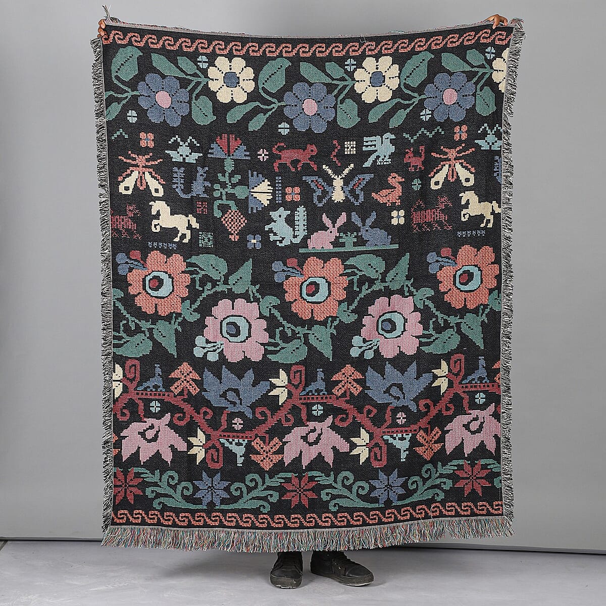 Black & Multi Color Jacquard Floral Woven Printed Cotton Throw with Fringes 1.65lbs | Cotton Throw Blanket | Soft Blanket