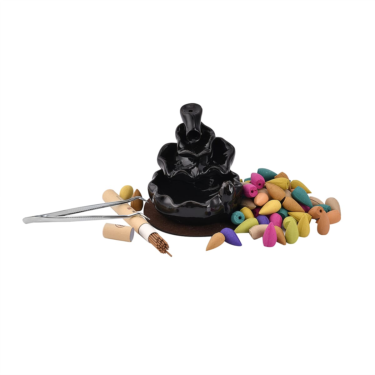 Black Ceramic Backflow Incense Holder Incense Burner Waterfall with 60 Backflow Incense Cones, 30 Incense Stick, 1p Tweezer and Base