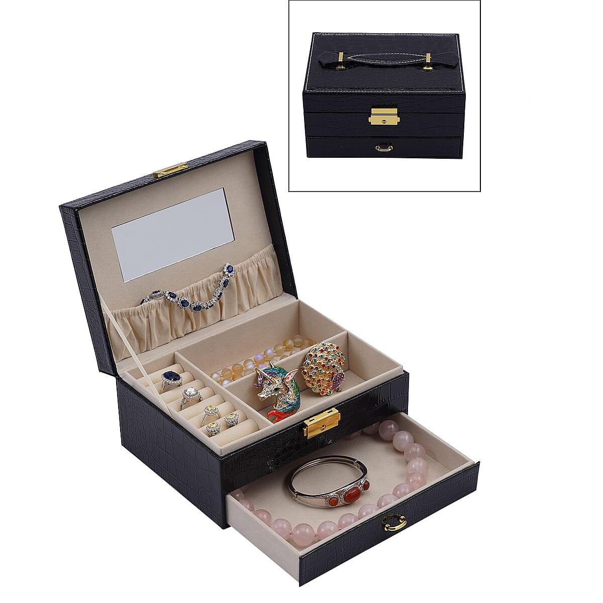 Black Croc Embossed Faux Leather 2 Layer Jewelry Organizer With Mirror Lock and Key | Jewelry Box for Women | Portable Jewelry Box | Jewelry Holder | Jewelry Storage | Jewelry Organizer