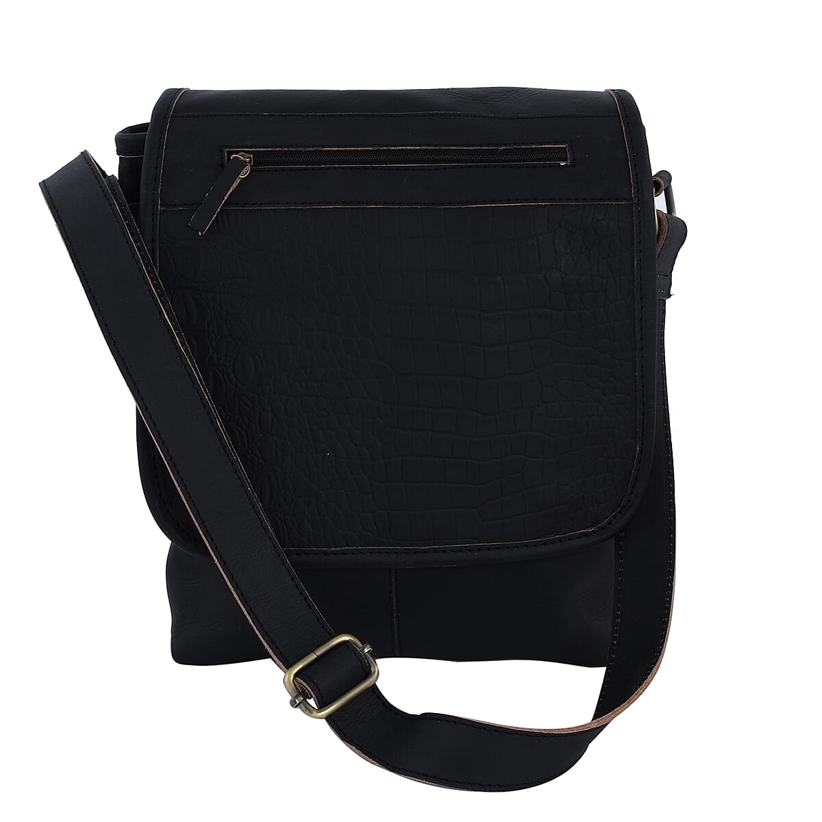 Black Croco Embossed Genuine Leather Flapover Crossbody Bag with Adjustable Shoulder Strap
