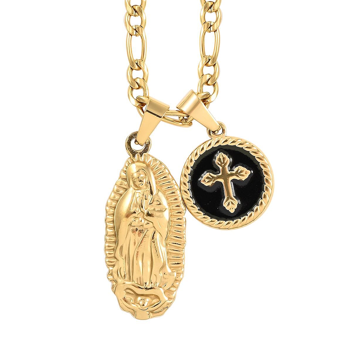 Black Enameled Lady of Guadalupe & Cross Pendant Necklace 24Inches in ION Plated Yellow Gold Stainless Steel