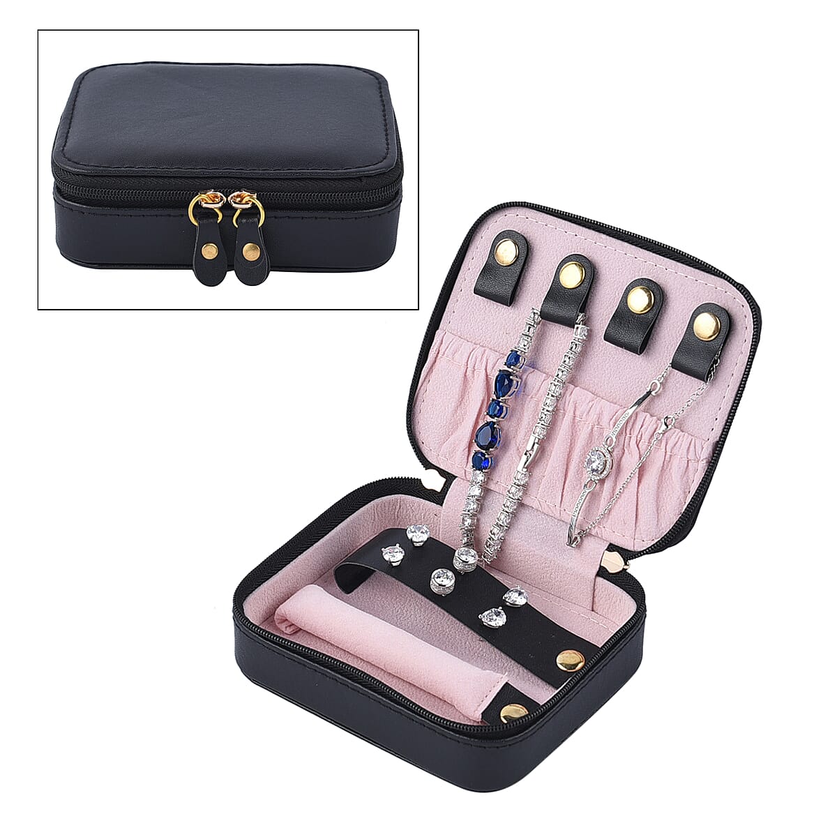 Black Faux Leather Small Jewelry Box with Anti- Tarnish Protection Lining & Double Zippers Closure (4 Necklace Hooks, 10 Earrings, Approx 6-8 Rings Slots)