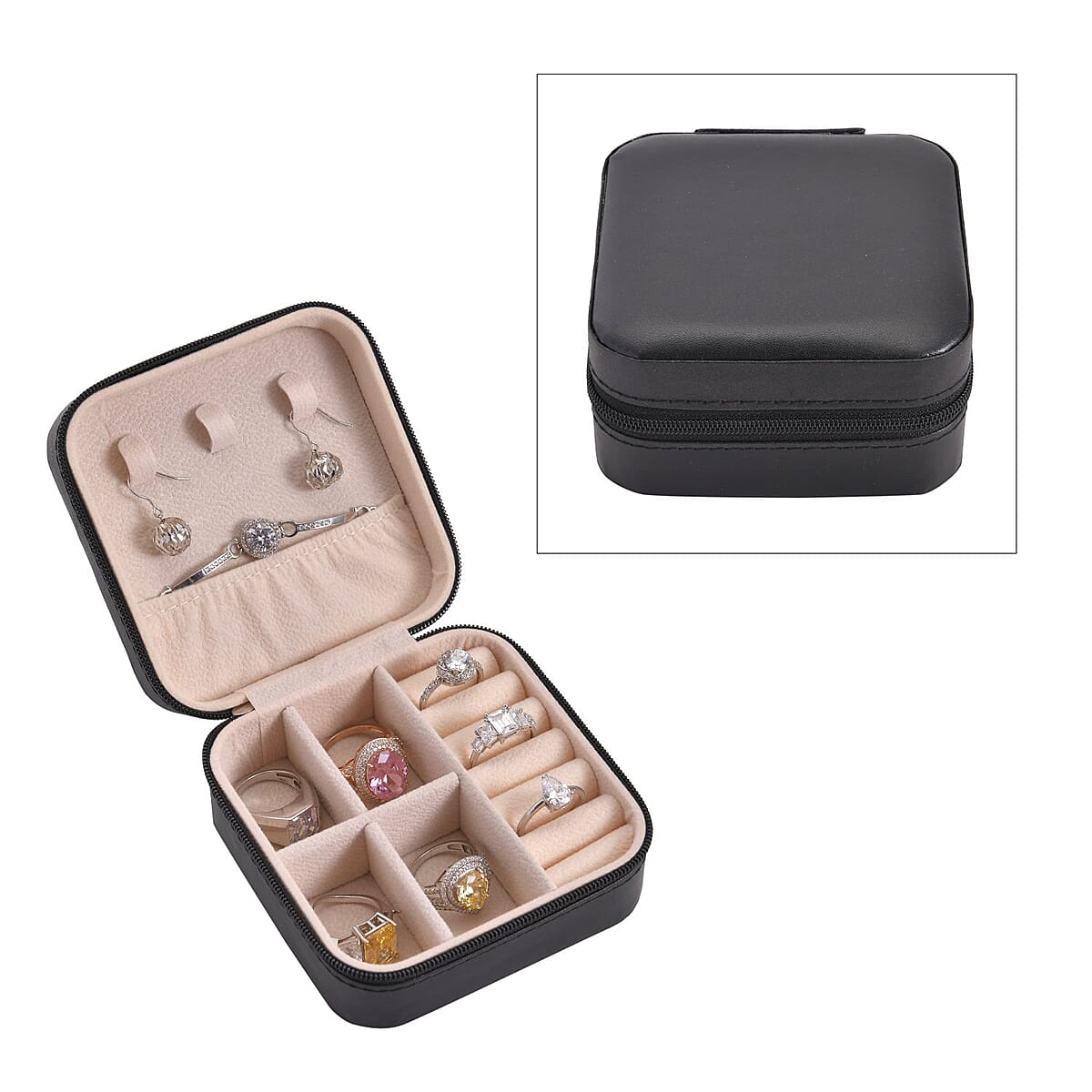 Black Faux Leather Small, portable, Travel Jewelry Organizer Storage Box With Zipper For Stud Earrings, Rings, Necklaces, Bracelets