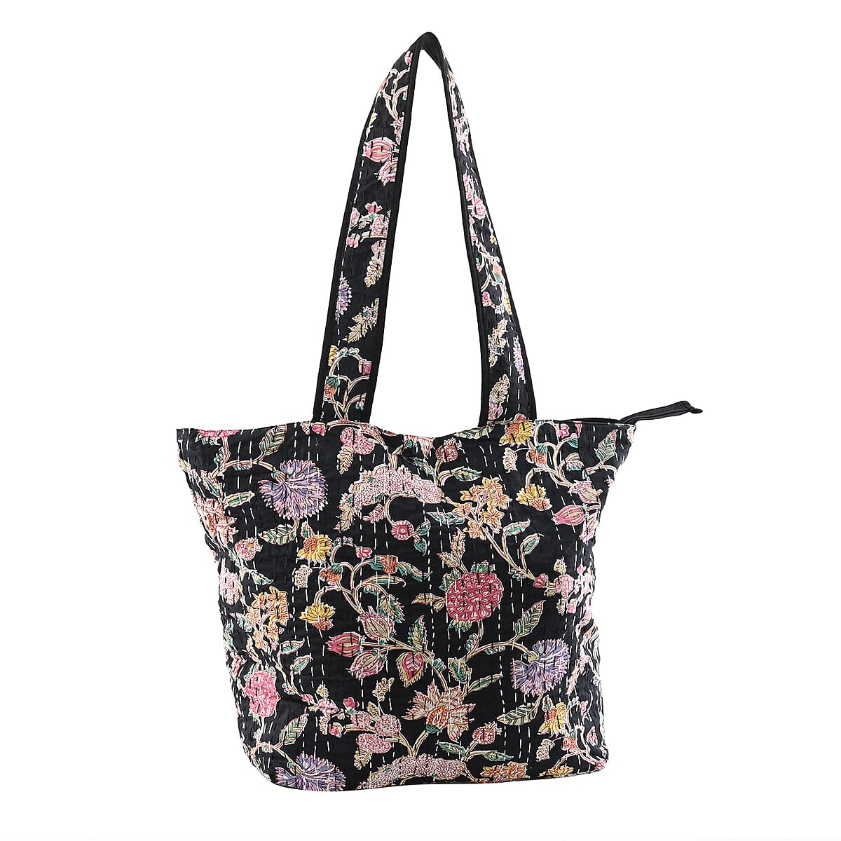 Black Floral Printed 100% Cotton Kantha Tote Bag (14"x18.5")
