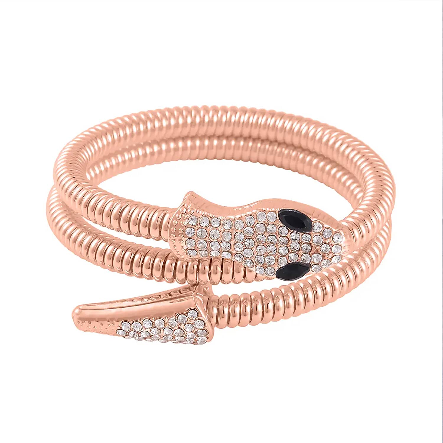 Black Glass and White Austrian Crystal Snake Link Chain Bracelet in Rosetone (7.00 In)