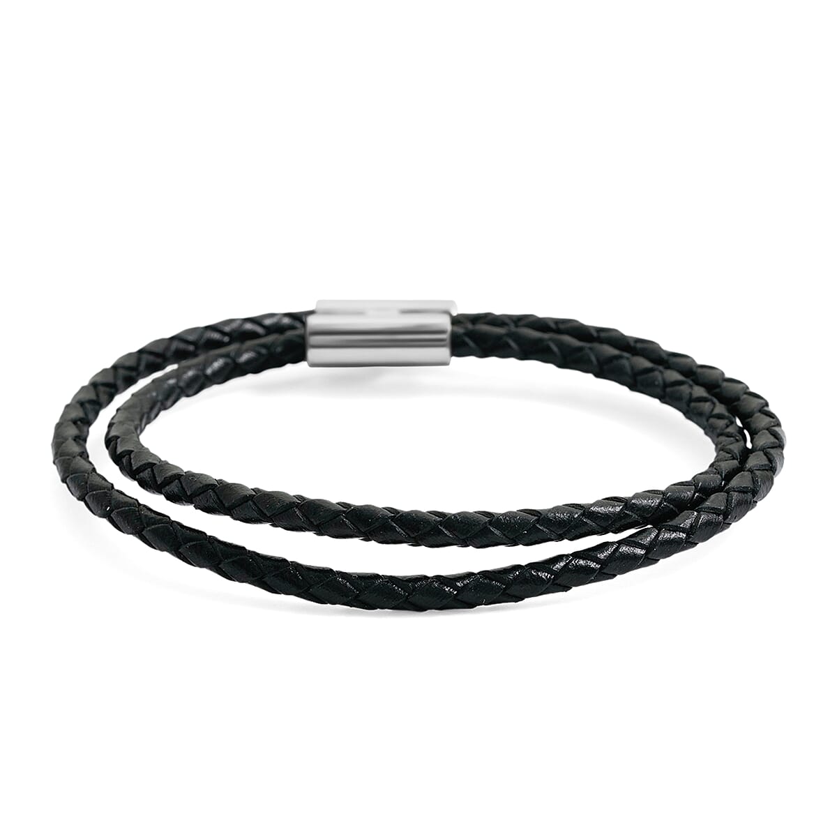 Black Leather Bracelet in Stainless Steel (7.00 In)