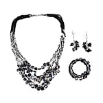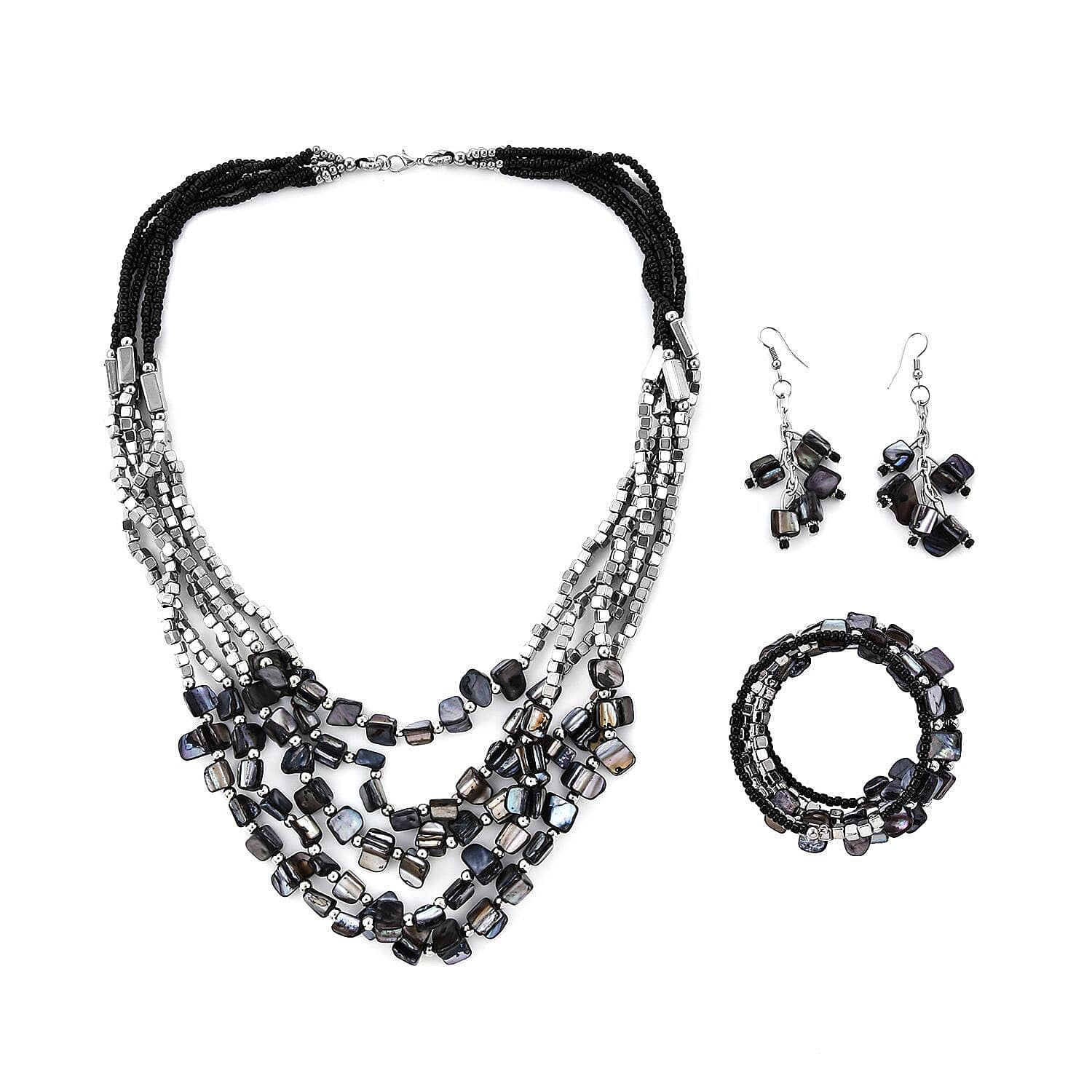 Black Seed Beaded Multi Strand Necklace With Wrap Bracelet Shell Earrings For Women in Stainless Steel, Handmade Jewelry Set For Women (22 Inches)