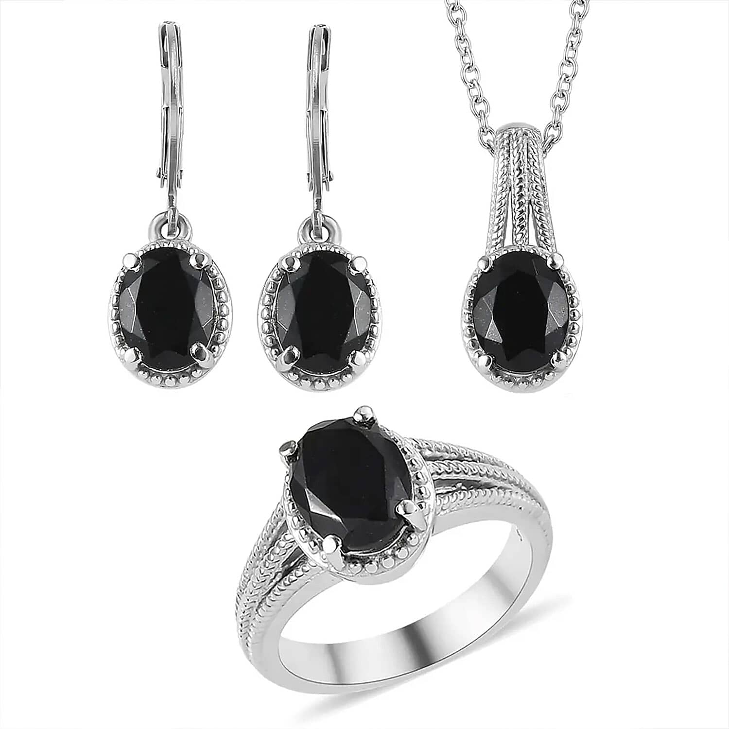 Black Tourmaline 8.00 ctw Lever Back Earrings, Ring (Size 7.0), Pendant Necklace 20 Inches in Stainless Steel