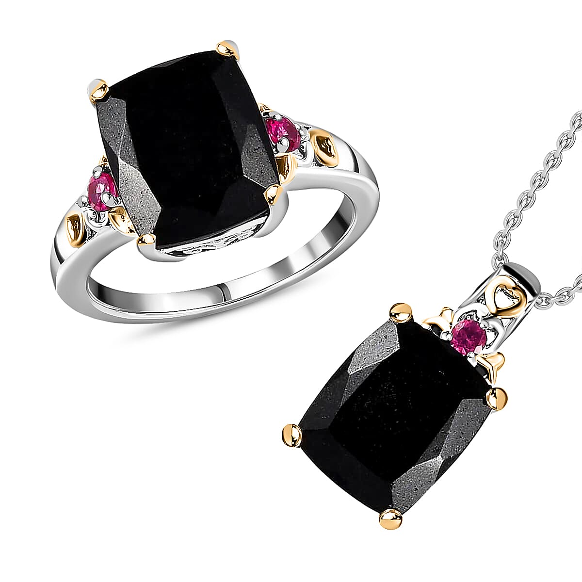 Black Tourmaline Jewelry Set, Orissa Rhodolite Garnet Accent Jewelry Set, Set of Tourmaline Ring and Tourmaline Pendant Necklace, 20 Inch Necklace, Vermeil YG and Platinum Over Sterling Silver Jewelry Set 12.35 ctw