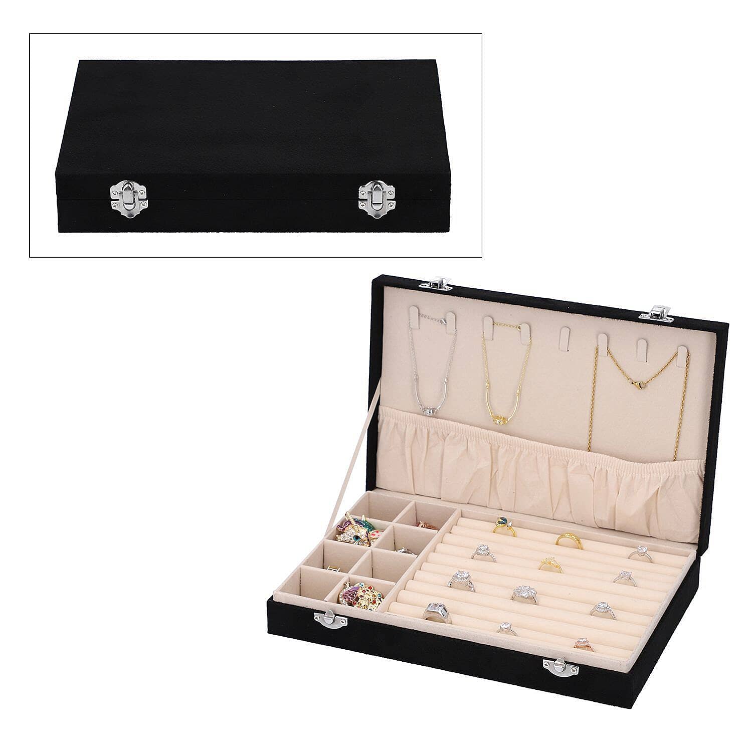 Small Compartments, Ring Slots, Necklace Hooks |