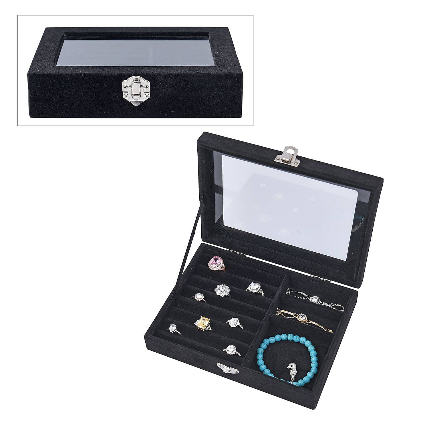 Black Velvet Jewelry Box with Anti Tarnish Lining & Lock (8x6x2) (Rings Hold Up to 28, Brooch, Pendant, Earrings)