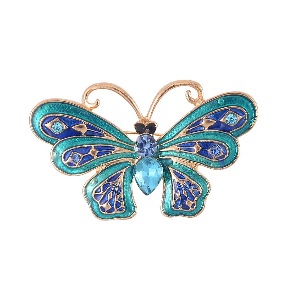 Blue and Black Austrian Crystal, Enameled Butterfly Brooch in Goldtone