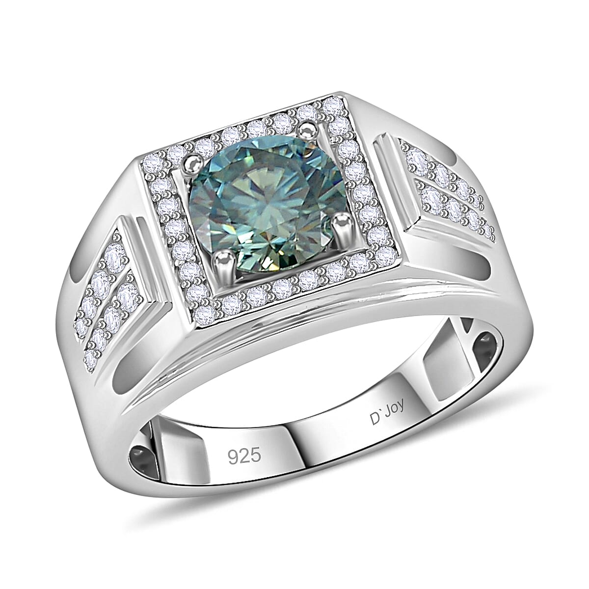 Blue and White Moissanite Men's Ring in Rhodium Over Sterling Silver 7.50 Grams 2.40 ctw