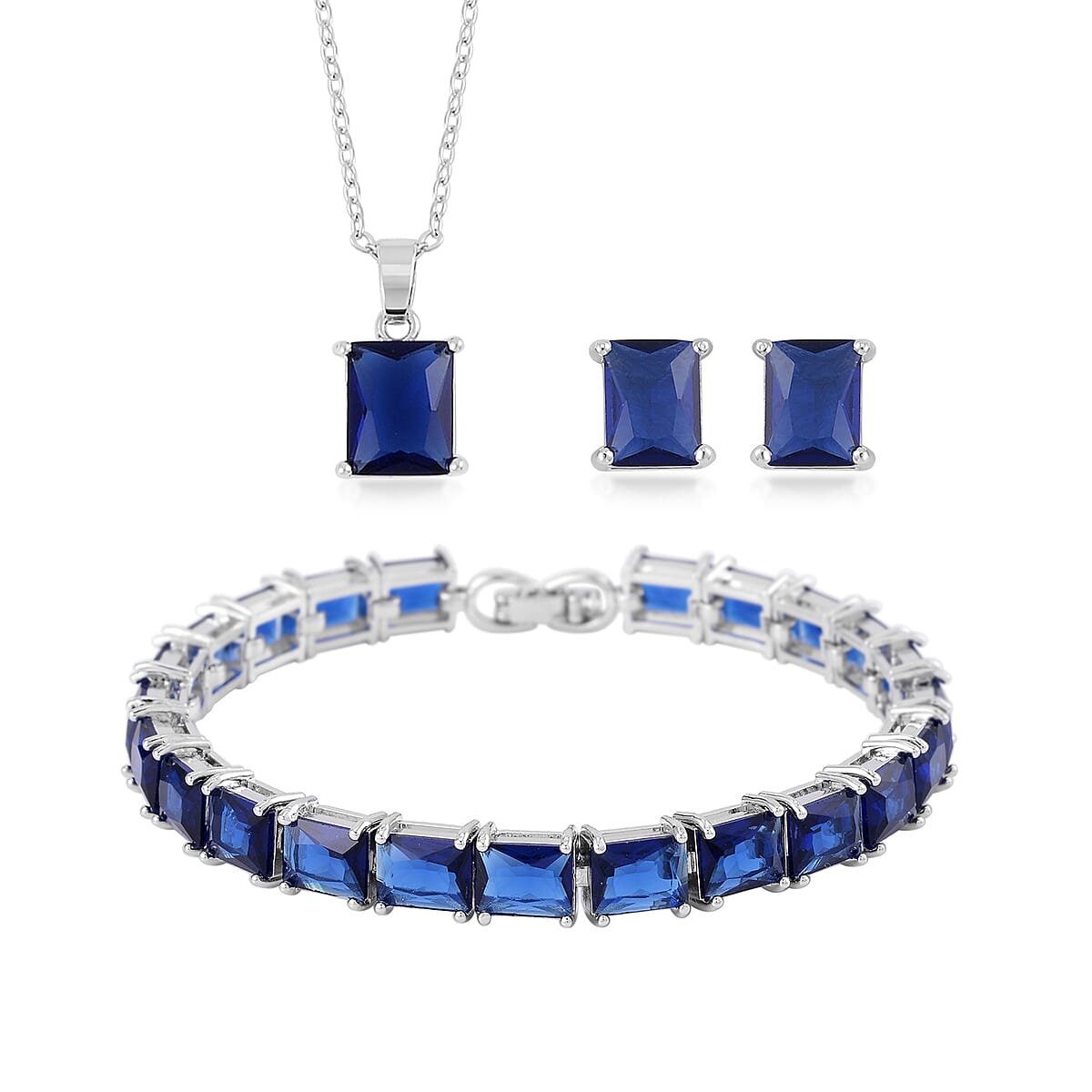 Blue Austrian Crystal Tennis Bracelet (8.0In), Stud Earrings and Pendant Necklace 20 Inches in Silvertone