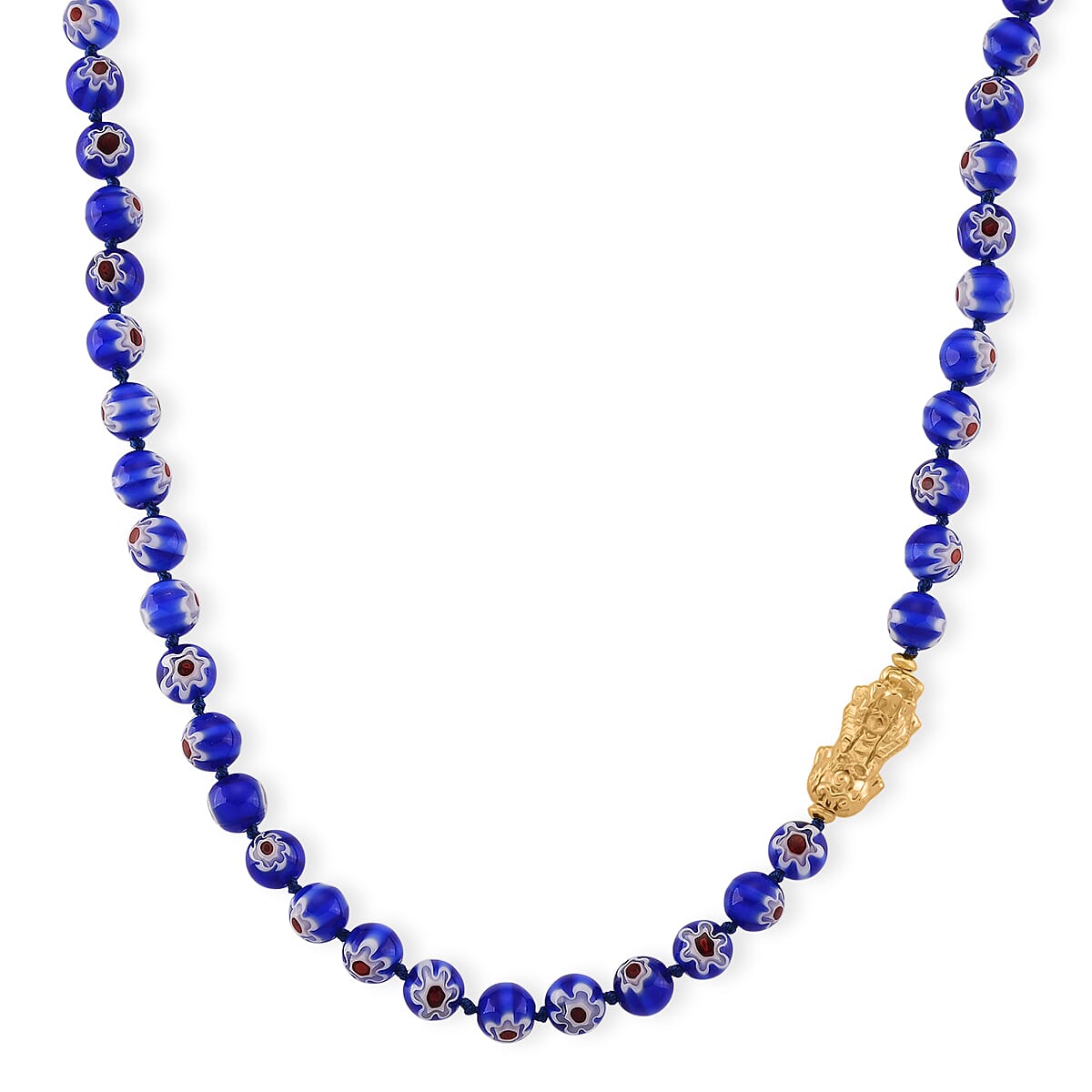 Blue Color Murano Style Beaded Necklace with Pixiu Charm in Goldtone 20 Inches