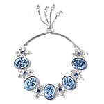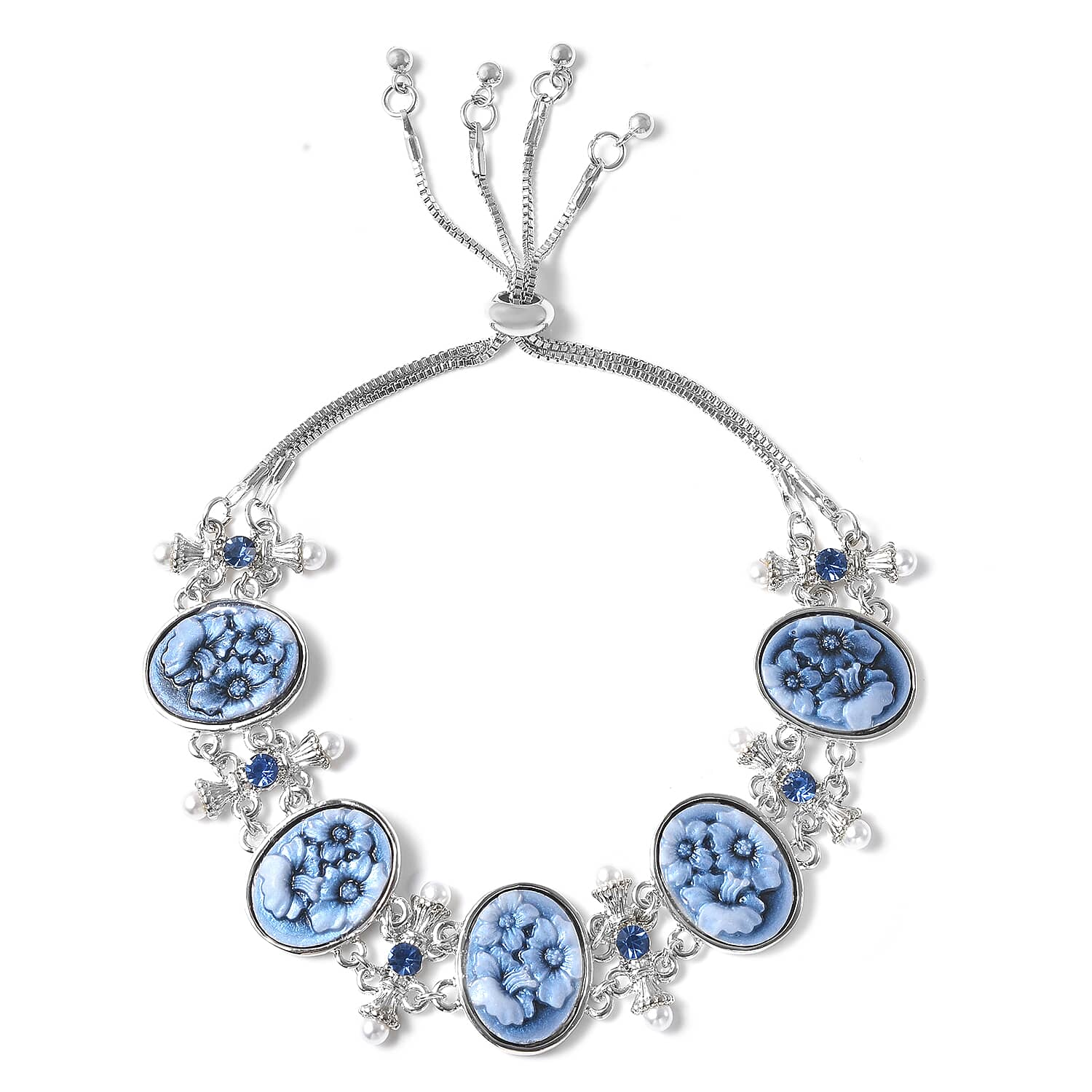 Blue Color Resin, Blue Austrian Crystal and Simulated Pearl Bolo Bracelet in Silvertone