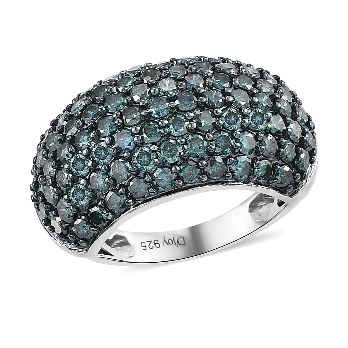 Sparkling with beauty and vibrance, this blue diamond cluster dome ring is an epitome of royalty. Embedded with the diamonds in the symmetric pattern, this diamond cluster ring looks no different than a celebratory ode to timeless jewelry designs and your ageless grace. Complementing the mighty tones of focal stones is the classic charm of metal with a rhodium finish.