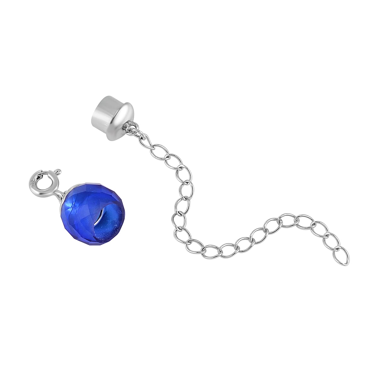 Blue Glass Magnetic Lock 2Inch Extender Chain with 5mm Spring Ring Lock in Rhodium Over Sterling Silver