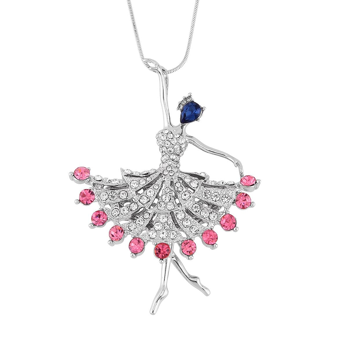 Blue Glass, Pink and White Austrian Crystal Dancing Ballerina Pendant Necklace 20-30 Inches in Silvertone