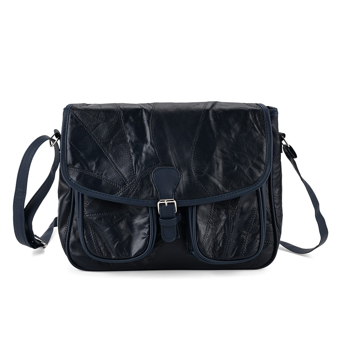Blue Patch Work Sheep Leather Crossbody Bag with Faux Leather Trim with Adjustable Shoulder Strap