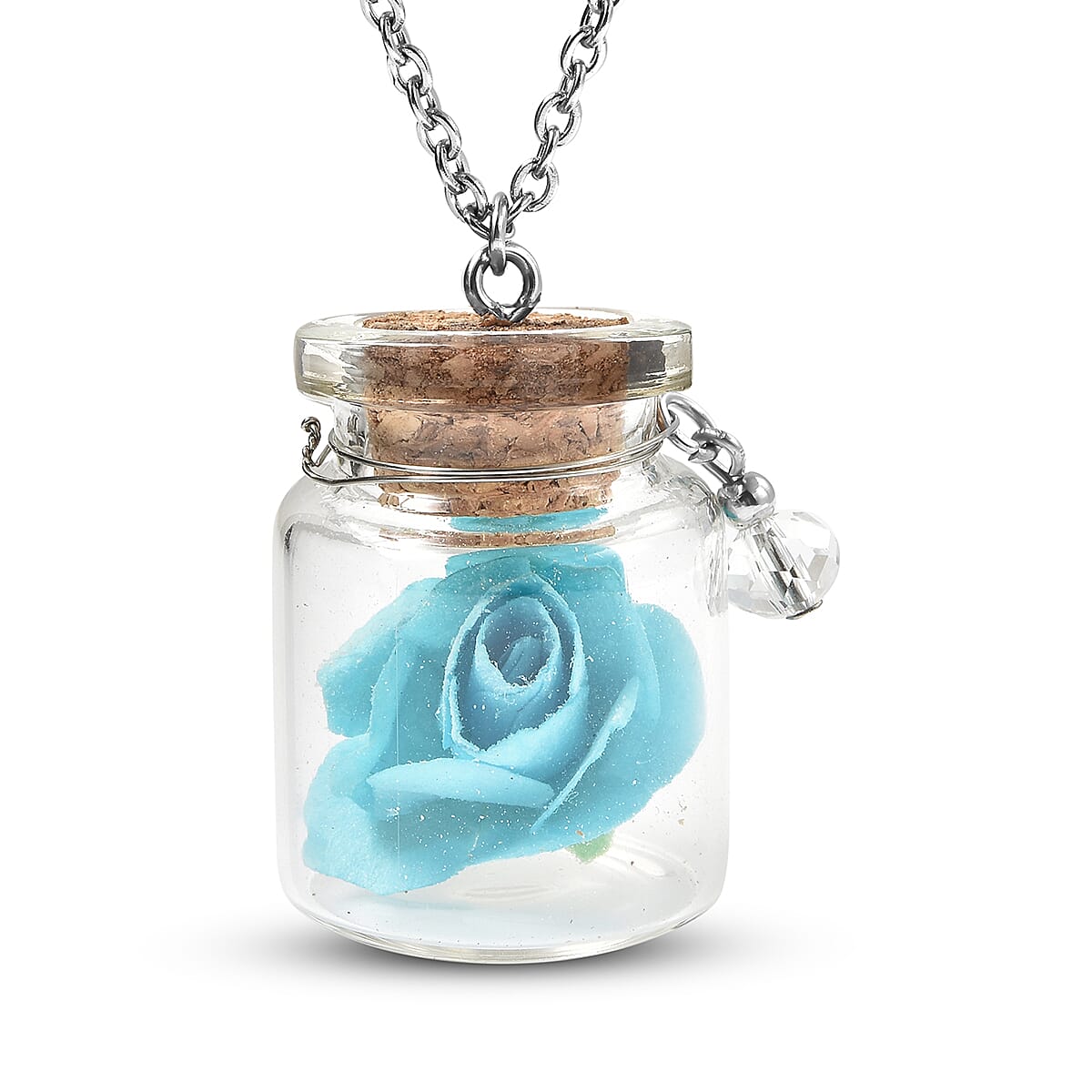 Blue Rose in Openable Glass Bottle Pendant Necklace 20 Inches with Charm in Stainless Steel