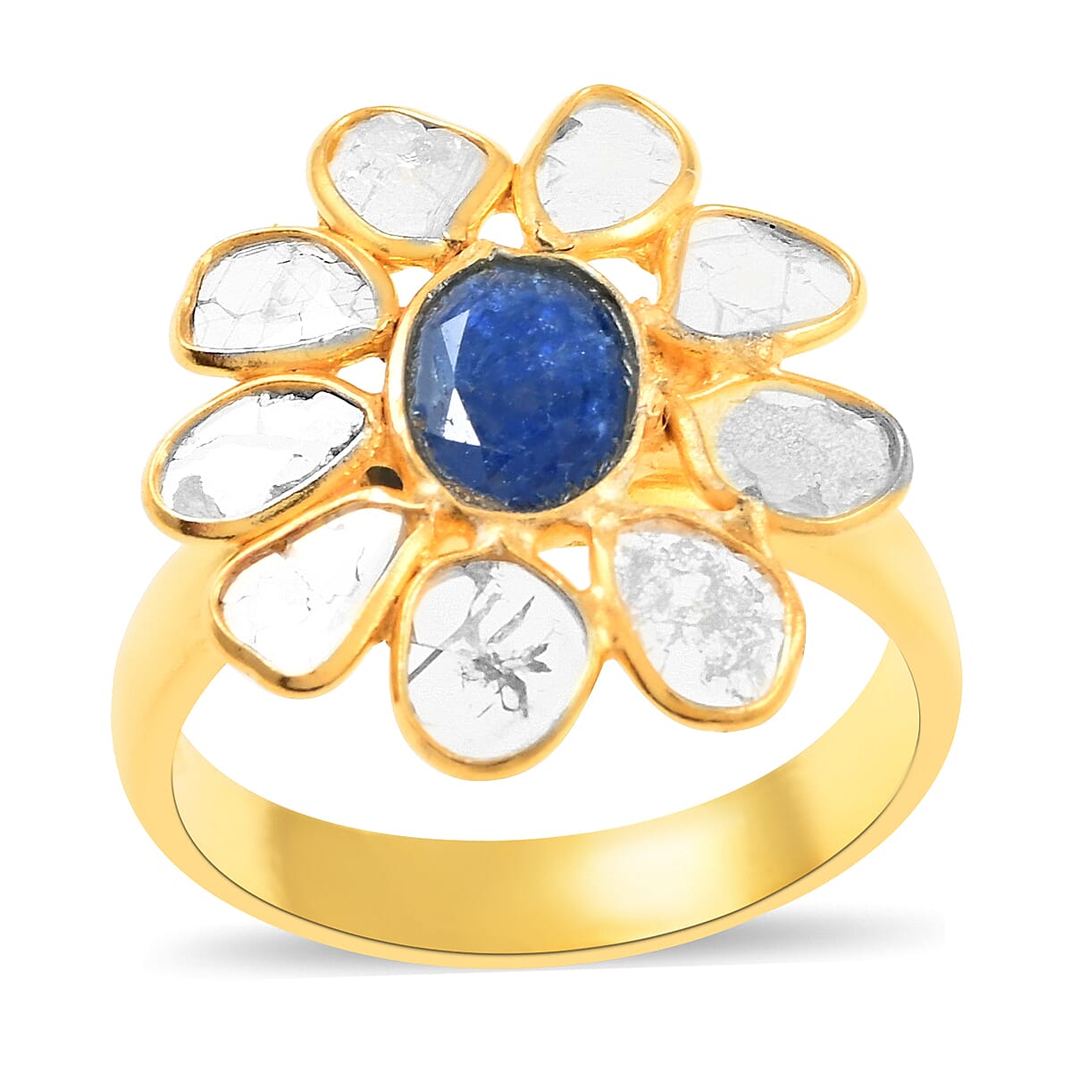 Blue Sapphire and Polki Diamond Flower Ring in 14K Yellow Gold Over Sterling Silver (Size 11.0) 2.05 ctw