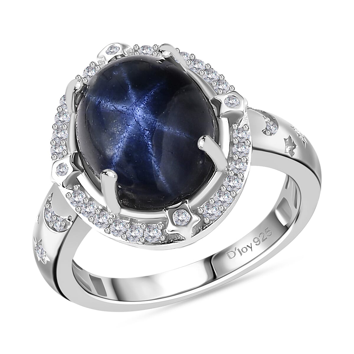 Blue Star Sapphire (DF) and Moissanite 6.50 ctw Celestial Ring in Rhodium Over Sterling Silver (Size 8.0)