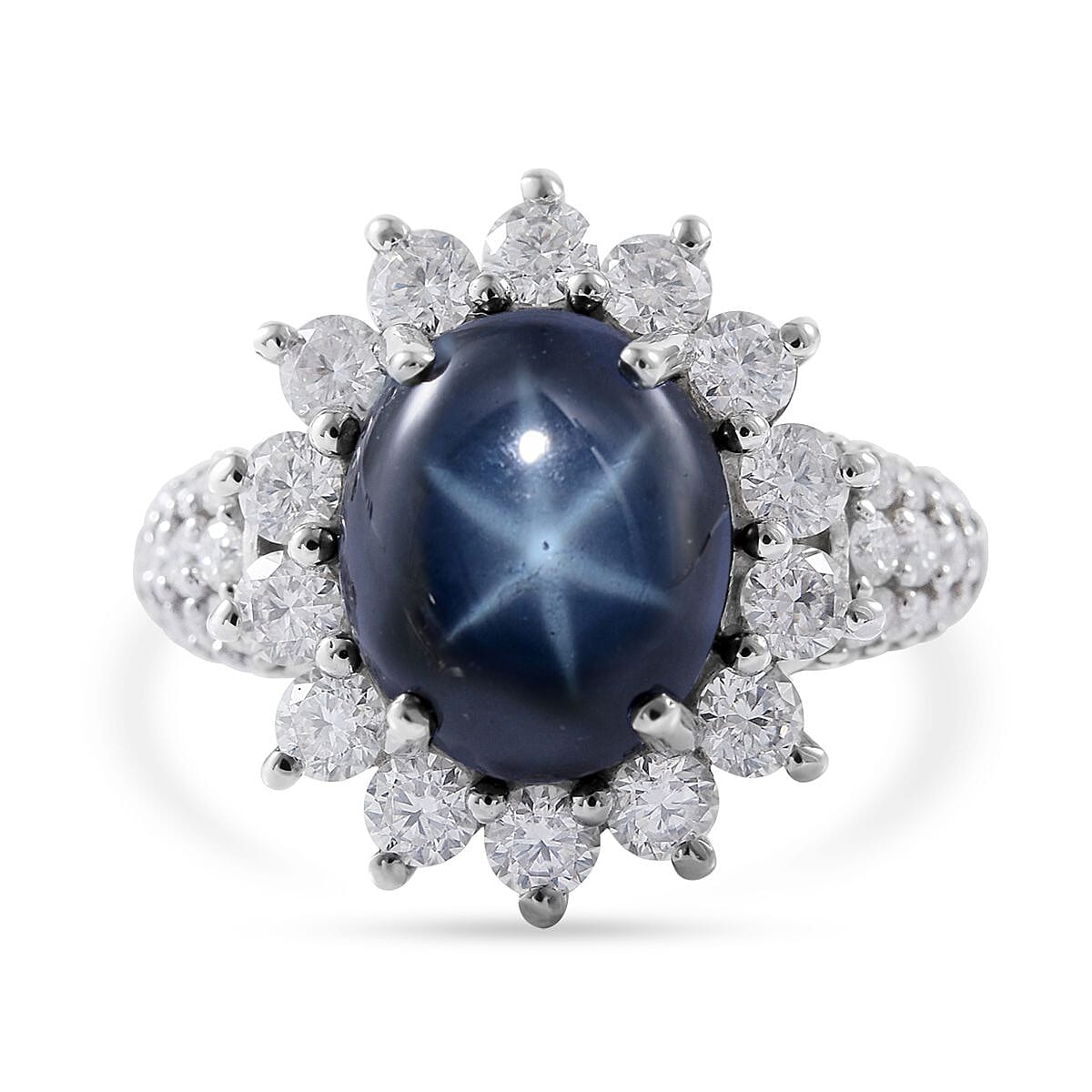 Blue Star Sapphire (DF) and Moissanite Sunburst Ring in Platinum Over Sterling Silver (Size 9.0) 7.50 ctw