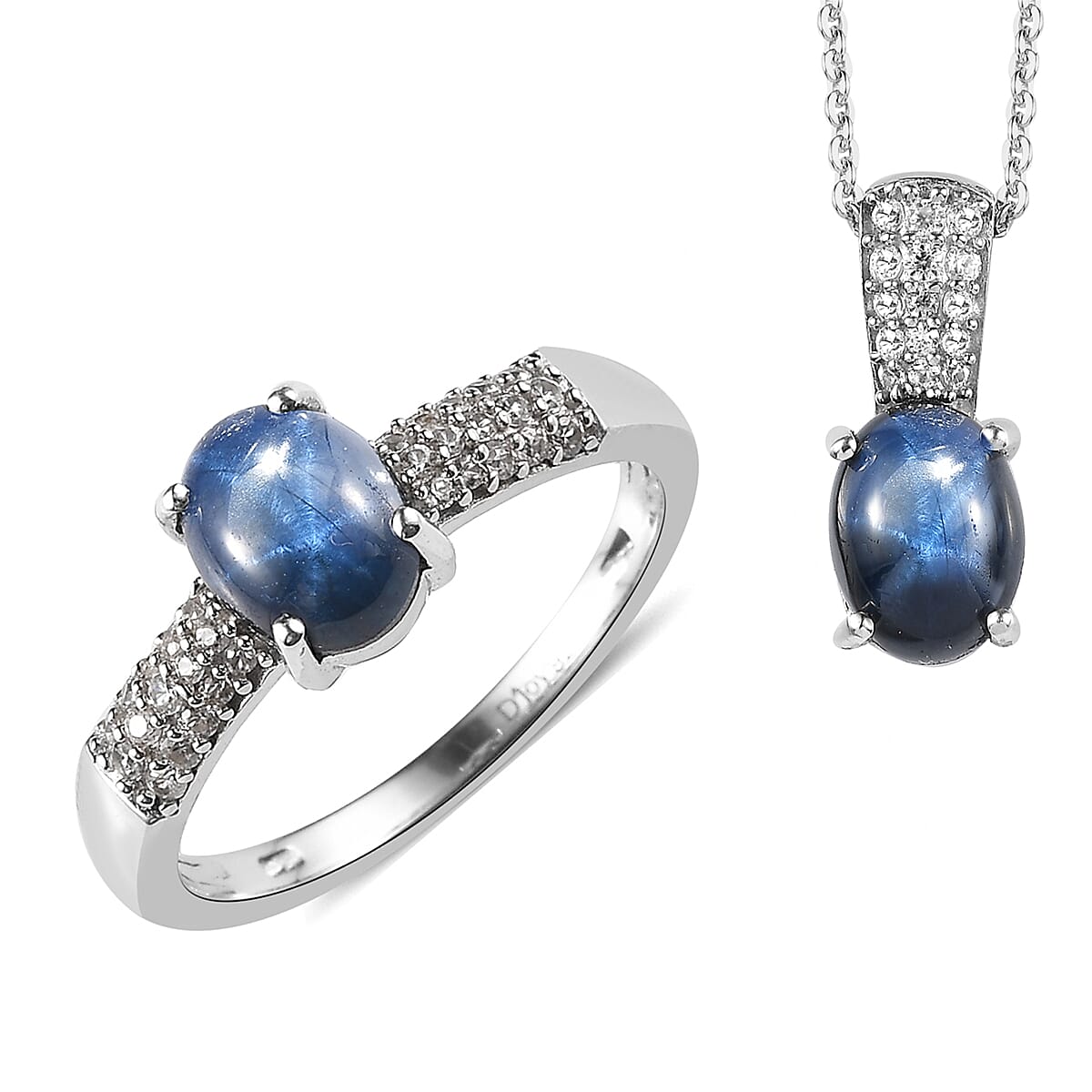 Blue Star Sapphire (DF) and White Zircon Ring (Size 9.0) and Pendant Necklace 20 Inches in Platinum Over Sterling Silver 4.85 ctw
