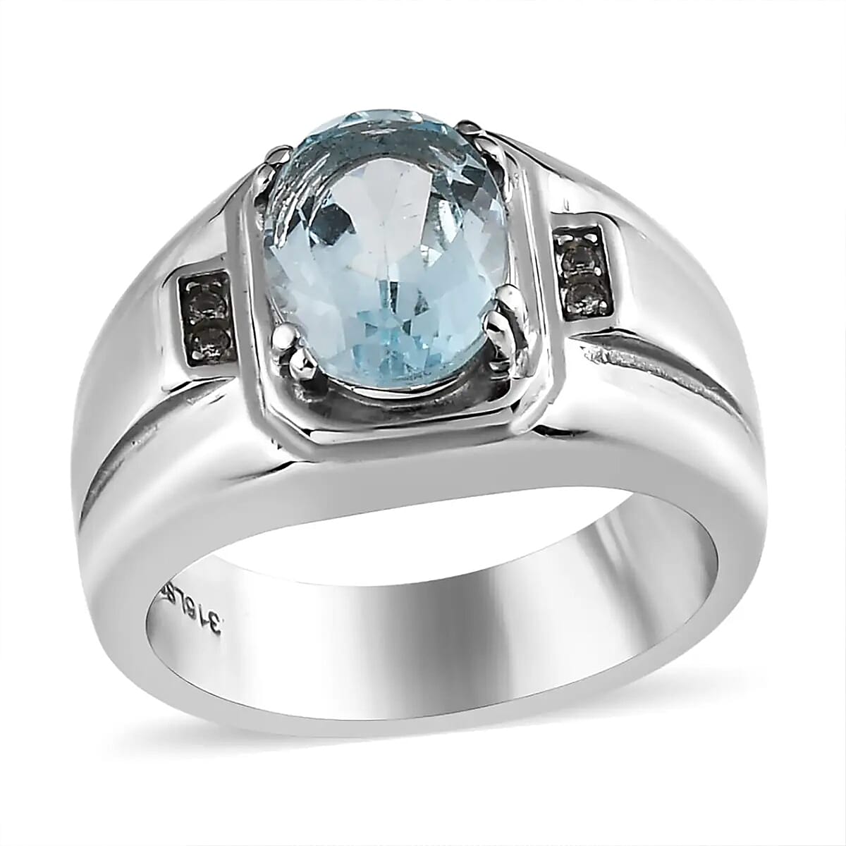 Blue Topaz, White Zircon Men's Ring in Stainless Steel (Size 10.0) 3.15 ctw