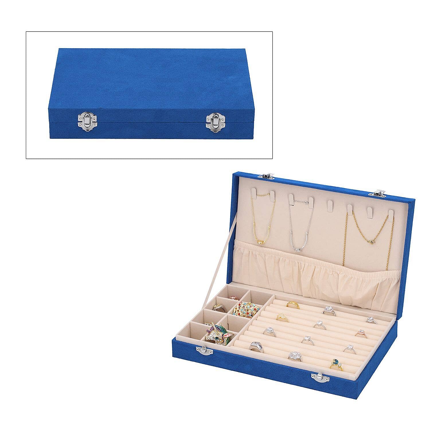 Small Compartments, Ring Slots, Necklace Hooks |