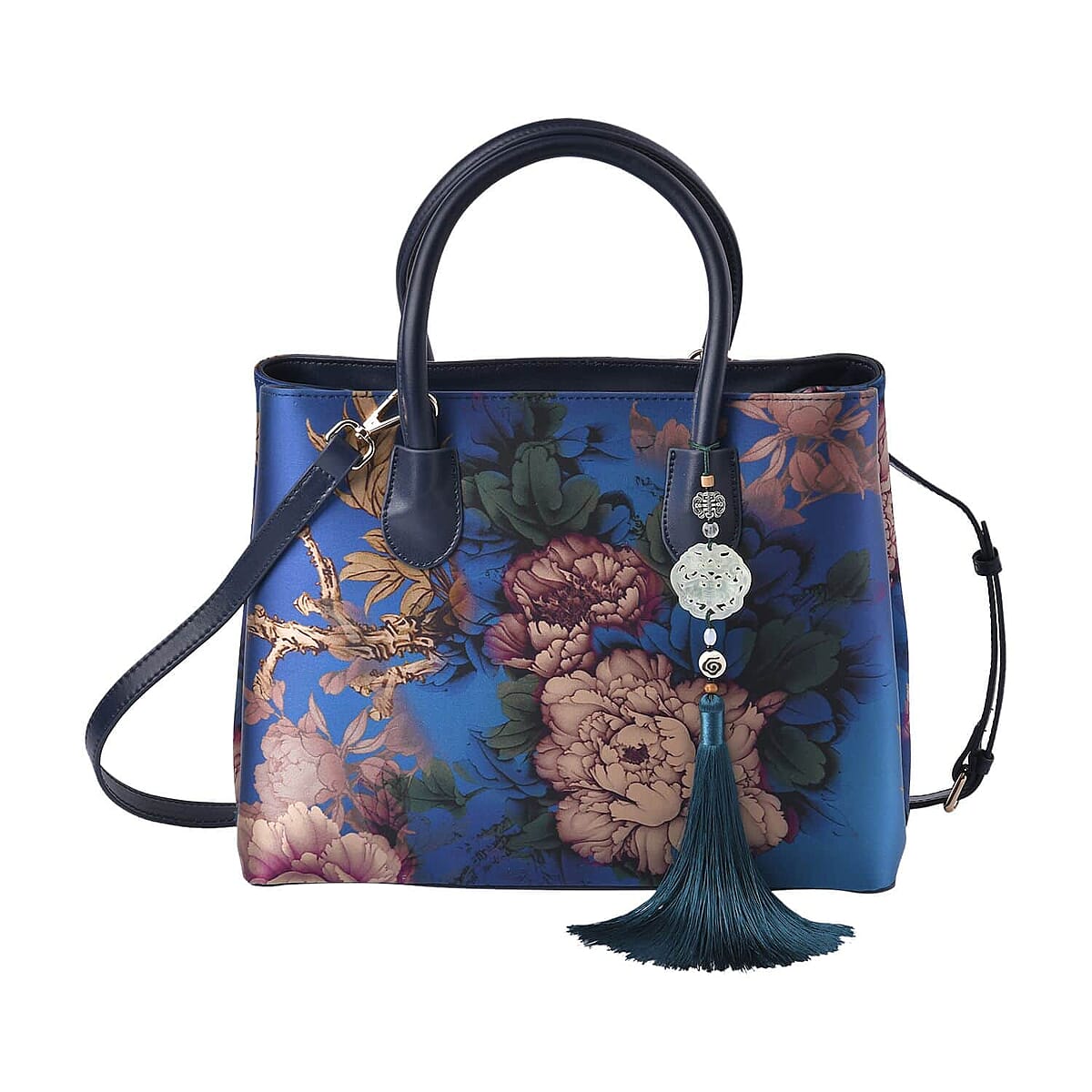 Blue with Big Flower Pattern Silk with Genuine Leather Tote Bag for Women with Hanging Jade Tassels | Women's Designer Tote Bags | Leather Handbags | Leather Purse