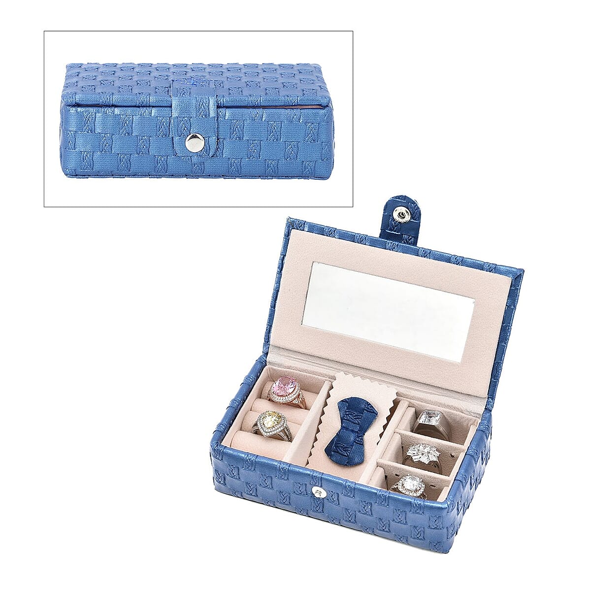 Blue Woven Pattern Faux Leather Small Travel Jewelry Box with Glass Mirror and Button Clasp