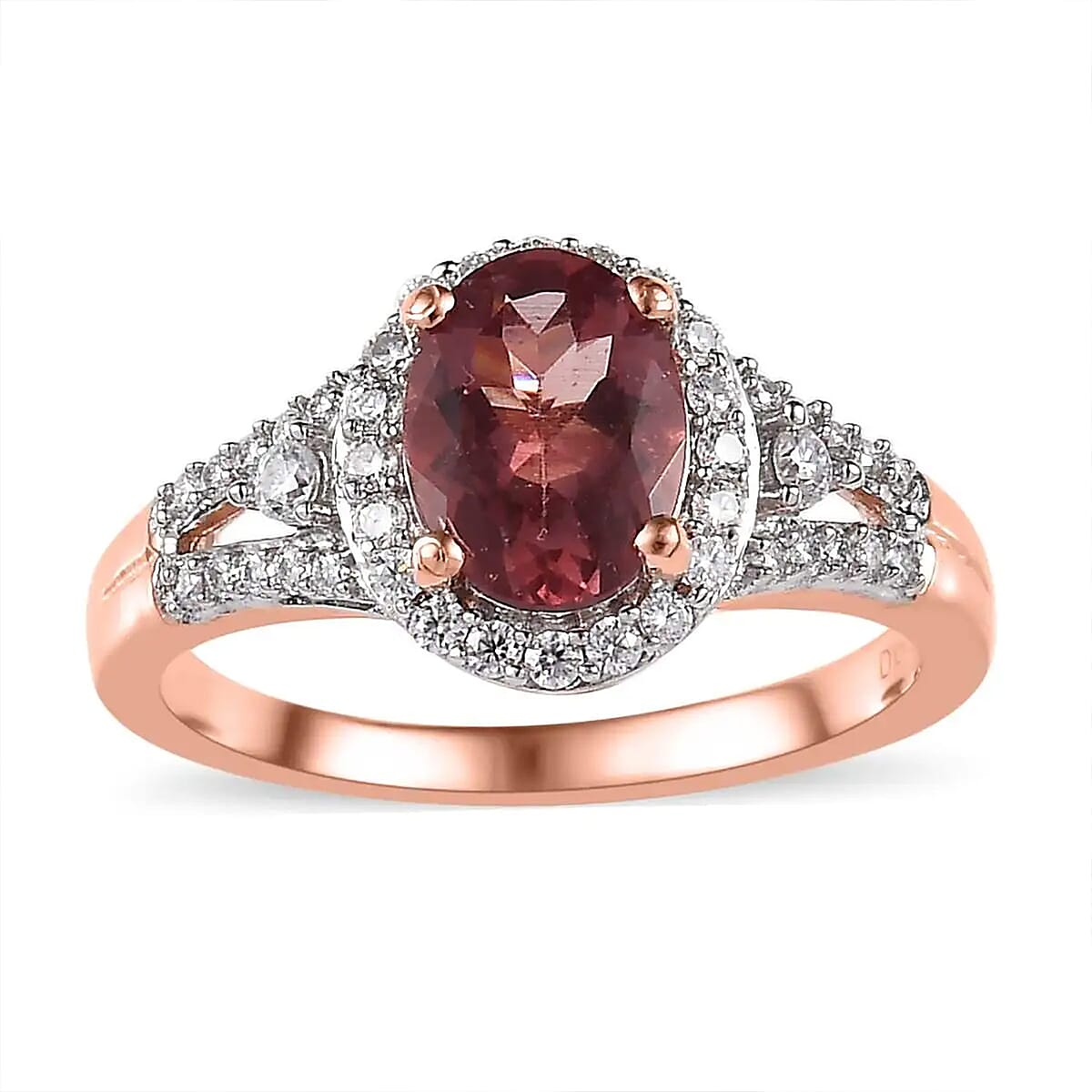 The enchanting blush apatite and moissanite halo ring are crafted in silver with a rose gold finish. Its split shank and halo enhance the subtle elegance of blush apatite, symbolizing unity and radiance, creating a distinguished accessory.