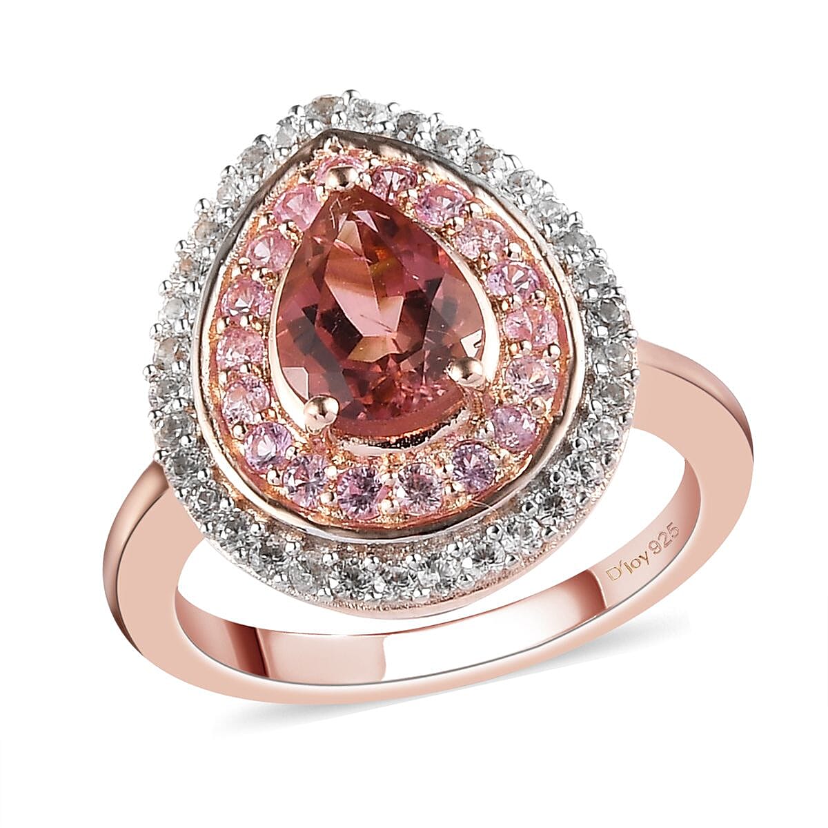 Inspired by the minimal play of sunset lights lingering on the ocean waves, this natural blush tourmaline double halo ring triumphs the glory of exceptional artistry. Blush tourmaline is finely organized, reflecting a visual symphony of soft hues with multi gemstones on the contours. Blush tourmaline displays pleochroic properties as the color shifts when viewed from different angles. This tourmaline ring is impeccably designed in sterling silver with vermeil rose gold finish to flaunt the sparkles of blush tourmalines. Gemstones highlighted with prongs maintain the prominence of the gemstone. The smooth under gallery of the ring is the finest definition of comfort and convenience with a pinch of elegance. This ring impersonates the genuine sentiments of love and grace.