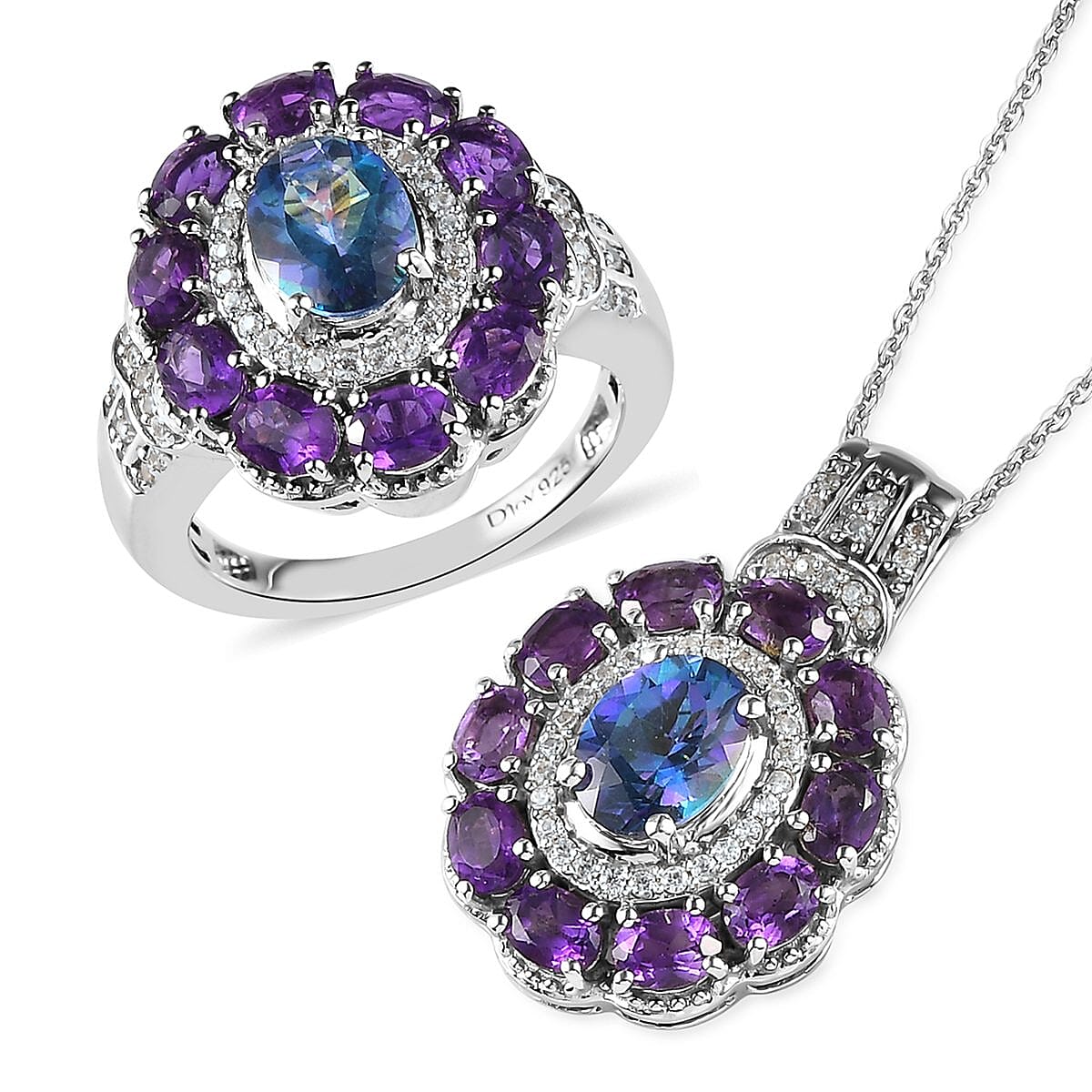 Brazilian Blue Petalite and Multi Gemstone Cocktail Ring (Size 7.0) and Pendant Necklace 20 Inches in Platinum Over Sterling Silver 5.85 ctw