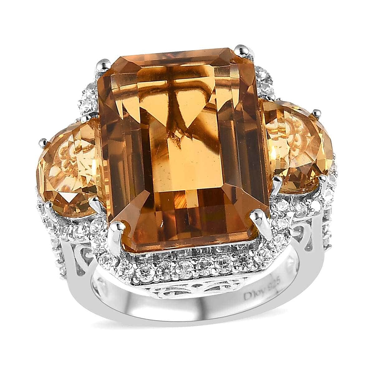 Elevate your style with the mesmerizing beauty of our Brazilian citrine ring. Featuring an octagon-shaped citrine at the center, flanked by D-shaped citrines on either side, and embellished with a periphery of white zircons, this art-deco-inspired ring sparkles with dual rows of zircons on the shank. With designer open scrolls on the sides and a luminous finish over sterling silver, it's a must-have for any jewelry collection.