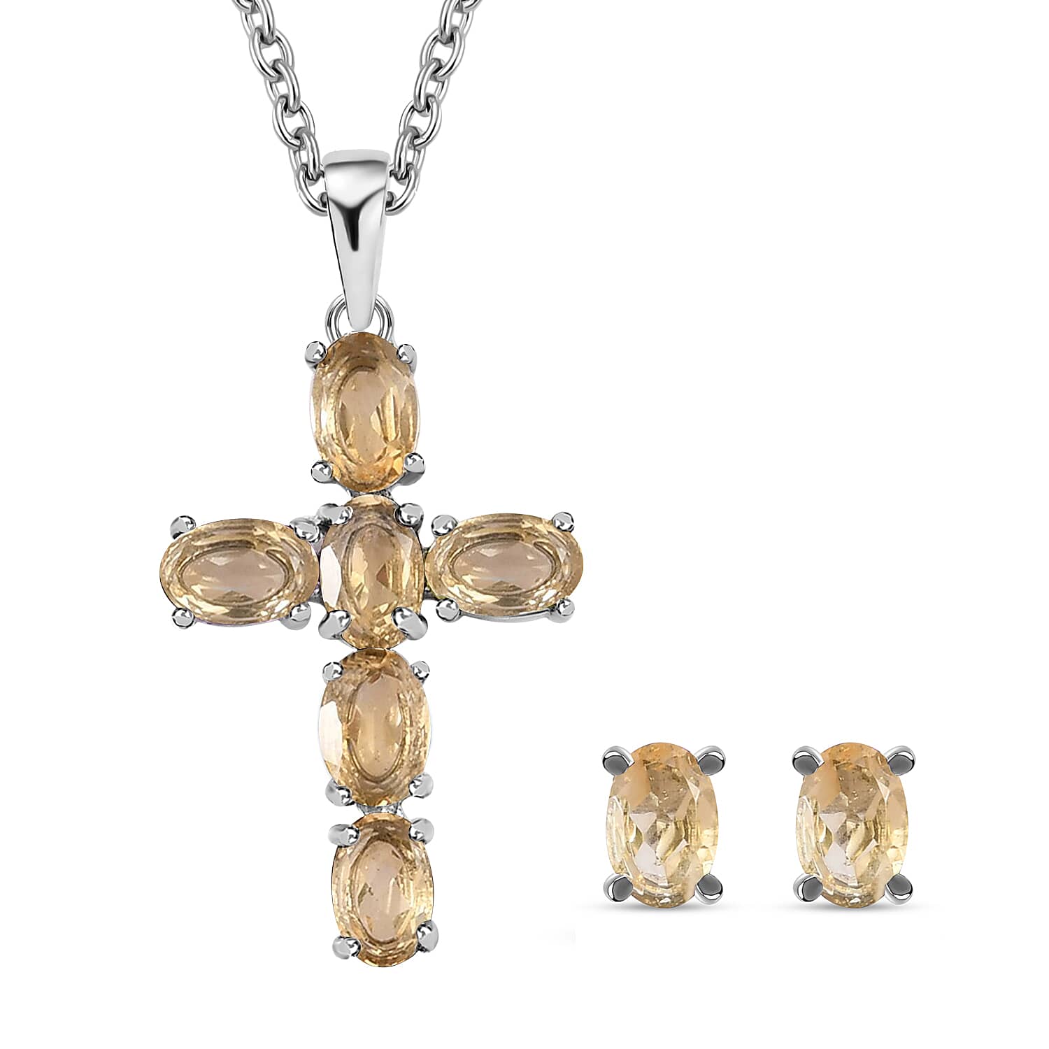 Brazilian Citrine Stud Earrings and Cross Pendant Necklace (20 Inches) in Stainless Steel 3.20 ctw , Tarnish-Free, Waterproof, Sweat Proof Jewelry