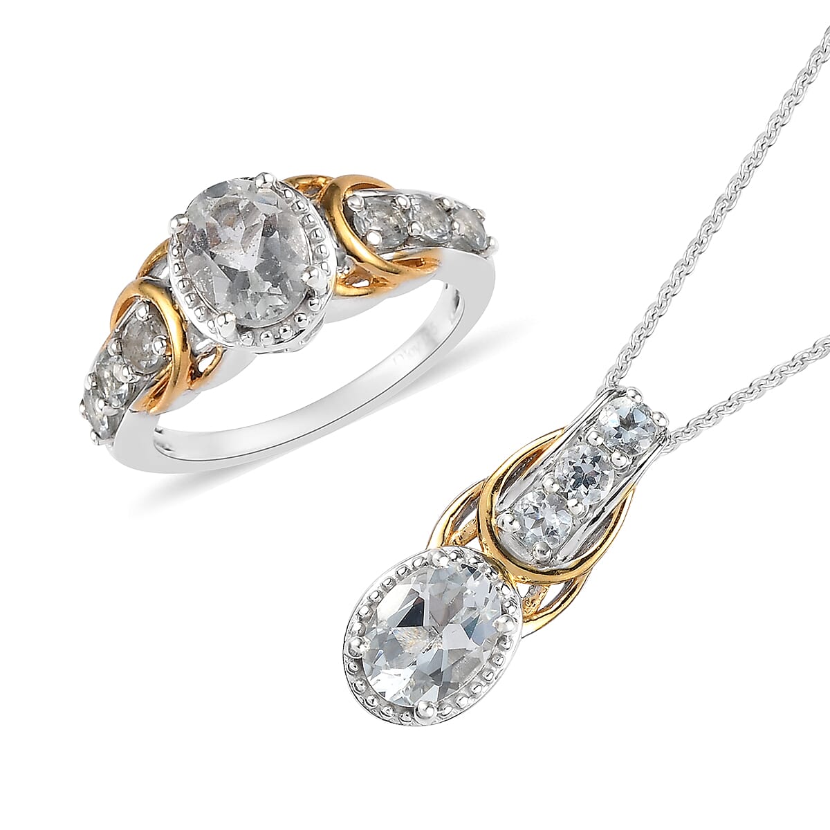 Elevate your look with this Brazilian goshenite jewelry set. The set comprises a ring and a 20-inch pendant necklace that showcases prong-set oval-shaped Brazilian goshenite gemstones, renowned for their clarity and brilliance. The jewelry's design is complemented by yellow tone metal frames and intricate granulated metalwork, giving it a designer feel. Brazilian goshenite is a rare type of colorless beryl, highly sought after for its unique properties, and makes a striking addition to any jewelry collection.