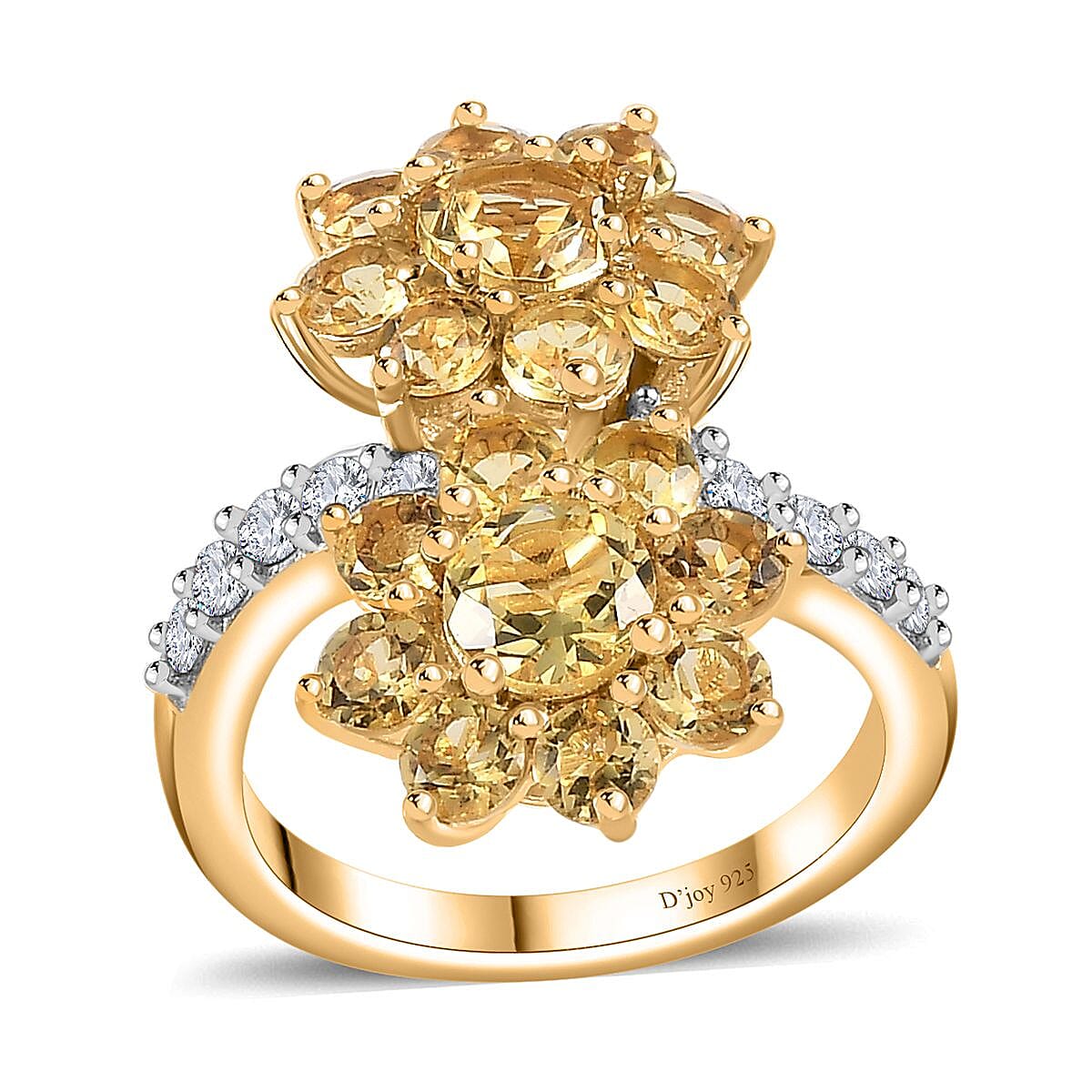 Adorn your fingers with this Sunfire beryl bypass ring in vermeil yellow gold over sterling silver featuring prong-set Sunfire beryl two flowers on each end of bypass band. This Sunfire beryl statement ring showcases prong-set white zircon accents on shank.