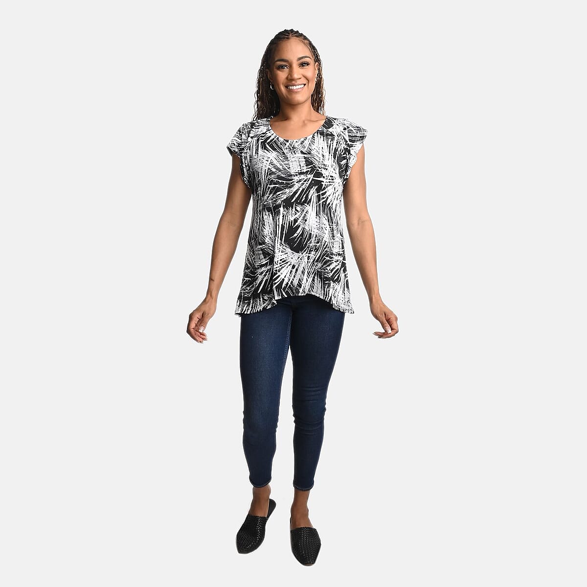 Revitalize your wardrobe with this Britany Black stretch blouse. The flutter sleeve blouse adds feminine flair to any outfit. Its sequin details create subtle sparkle for added glamour. This pattern blouse offers comfort and style simultaneously.