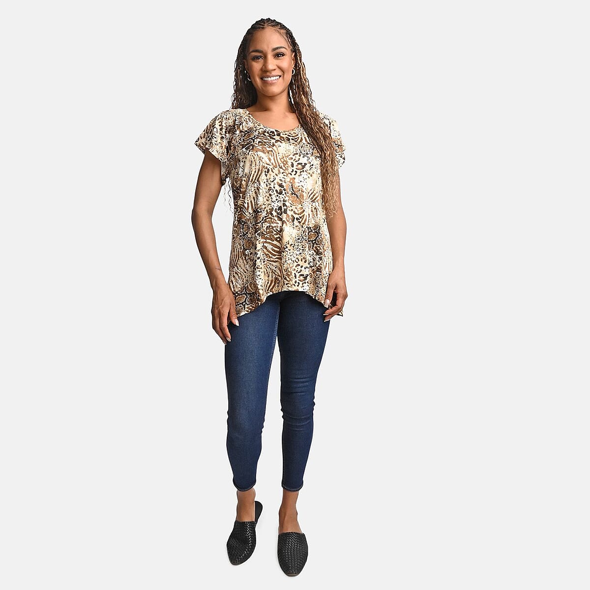 BRITANY BLACK Brown Animal Stretch Flutter Sleeve Blouse with Sequin - XL